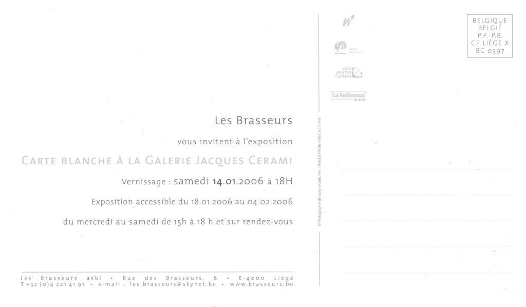 Carte Blanche à la Galerie Jacques Cerami Les Brasseurs, Janruary 18 – February 4, 2006 Liège, Belgium