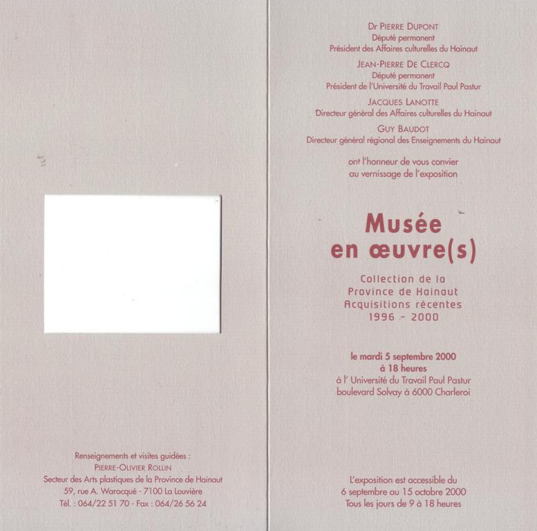 Musée en oeuvre(s) Université du Travail Paul Pastur, September 6 – October 15, 2000 Charleroi, Belgium